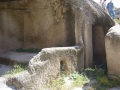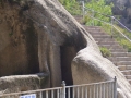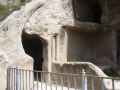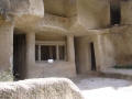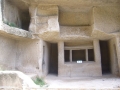 古崖居前区面积最大,但损坏的程度也最严重。整个山体看去,坍塌的部分使石窟从中剖开,内部结构和布局一目了然,特别是那些原在石窟内连接上一层,现已坍塌的残留石阶,看的更是一清二楚。在一幢相通的两居室和三居室,可以看那些修凿有回龙弯道的火炕,和设施齐全的厨房及卧室,抚摸那光滑笔直的墙壁,站在堂屋伸臂测量顶高,寻找古人在此居住时的真实感觉,体会西奚民族的生活习性和方式,探讨先人们修建防御工事和民居建筑的思路,令人感慨万分。