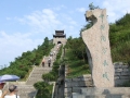 从东面爬长城,可路过常昊和曹熏铉塑像,长城在这里“之”字上拐,到达全胜营兵屯最高点时举目四望,周边景象一览无余。明清时期的南方长城大都倾废,断断续续剩有80余处遗迹,现在所见蜿蜒于山梁的都是近年修缮的。此墙以北,就是所谓的“生苗”地区。放眼望去,山梁之间,绿树掩映之下苗寨隐约其中。想着过去从明代中期到清代末期近300多年的时间里,对生苗区发动的大型征剿战争36次,平均不到10年就要进行一次较大的战争,以及无法记数的小型征伐,不难体会到当时生苗区苗民所处的严峻紧张。