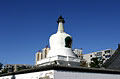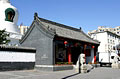 从山门进入,眼前就是西塔。西塔的塔刹是黑色的,可能是时间长了销蚀氧化的结果,塔身也为白色,和其他的三塔没什么区别。塔正南的地面上放着一个巨大的鼎式香炉,有人在烧香跪拜。绕过白塔,正对面是法王殿。左右两侧各有通往后殿的角门。寺院的后院正中是大雄宝殿。东西为四处配殿